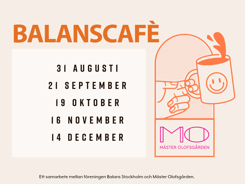 Va det nån som sa fika...? Vi och Mäster Olofsgården bjuder in till Balanscaféer en gång i månaden. Balanscafét är en mötesplats för alla som vill träffa oss och ta reda på vilka vi är och vad vi gör! Det är ett bra tillfälle att lära känna föreningen och träffa andra medlemmar i en trygg gemenskap. Att dela erfarenheter med andra i liknande situation eller med liknande erfarenheter brukar vara hjälpsamt.