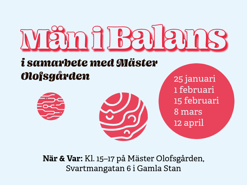 Efter en pilotträff hösten 2025 kommer vår mansgrupp bli ett återkommande inslag. I samarbete med Mäster Olofsgården bjuder vi in er män som har egenerfarenhet eller anhörigerfarenhet av bipolär sjukdom, depression, utmattningssyndrom eller annan stressrelaterad psykisk ohälsa till vårens träffar.